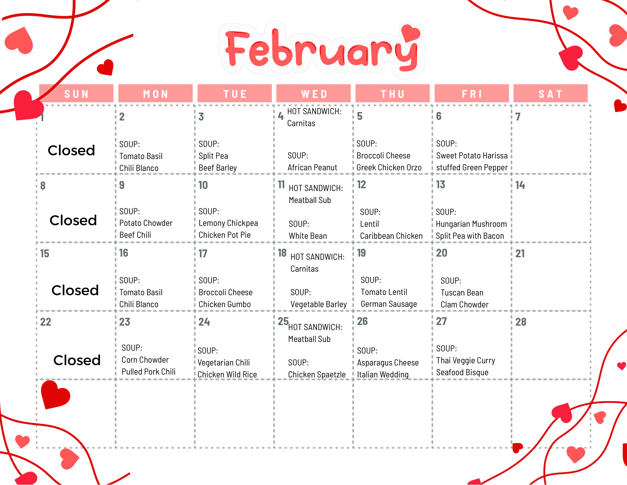 We serve up two soups daily (except Wednesday, when we have a hot sandwich special), ranging from classic favorites to our unique signature selections.
